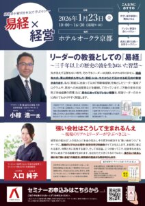 お知らせ 2026/1/23セミナー動画を投稿いたしました 2025年1月23日(金)にホテルオークラ京都にて開催した、 「経営者が経営を学ぶセミナーVol.26」の 第一部~第四部の 講演動画 及びスライドを 「過去セミナー動画」ページに追加いたしました。 下記リ 続きを読む » 2026年1月30日