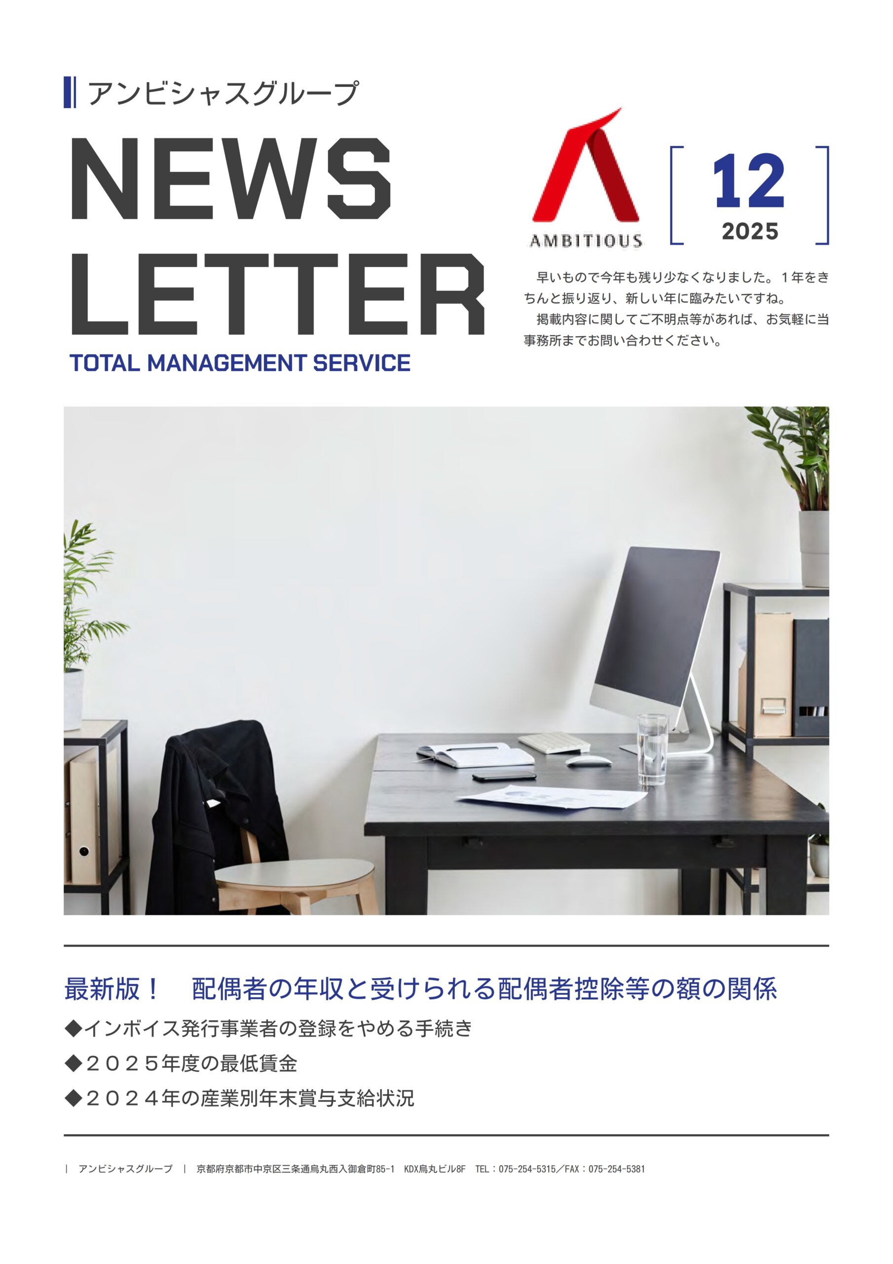 【ニュースレター】2025年12月号 ニュースレター2025年12月号 Topics ①【税務情報】最新版!配偶者の年収と受けられる配偶者控除等の額の関係 【税務情報】インボイス発行事業者の登録をやめる手続き ②【労務情報】2025年度の最低賃金 ③【経営情報】2024年の産業別年末賞与支給状況 この投稿にアクセスするには 会員プラン – Silver-member.をご契約する必要があります。
